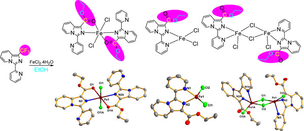 Abstract: A practical strategy for the preparation of a series of iron(II) complexes has been developed. This methodology features in situ esterification of the CF3 group on the backbone of the PIP–CF3 ligand (HPIP = 3-(pyridin-2-yl)imidazo[1,5-a]pyridine, PIP–CF3 = 3-(pyridin-2-yl)-1-(trifluoromethyl)imidazo[1,5-a]pyridine) by a wide range of alcohols. Treatment of FeCl2·4H2O with the PIP–CF3 ligand in EtOH under solvothermal conditions leads to the formation of complexes [Fe(PIP–COOEt)2Cl2] (1), [Fe2(PIP–COOEt)2Cl4] (2), and [Fe(PIP–COOEt)Cl2] (2′) (PIP–COOEt = ethyl 3-(pyridin-2-yl)imidazo[1,5-a]pyridine-1-carboxylate). EtOH serves as a solvent and is also involved in the esterification of the CF3 group. The esterification protocol features a broad substrate scope. The CF3 moiety of the PIP–CF3 ligand could be esterified by a wide range of alcohol substrates. Compounds [Fe(PIP–COOnPr)2Cl2] (3), [Fe2(PIP–COOnPr)2Cl4] (4), [Fe2(PIP–COOiPr)2Cl4] (5), and [Fe(PIP–CF3)2Cl2]·iPrOH (6·iPrOH) were isolated, and their structures were characterized. The mechanism for the esterification of the CF3 group was proposed by examining the conditions for the esterification transformations.