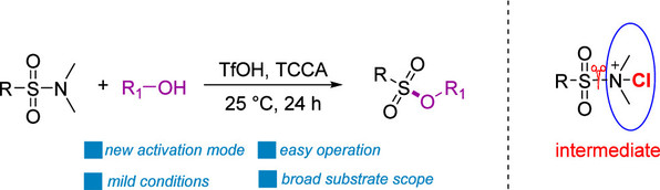 Abstract: Under the combined action of trichloroisocyanuric acid (TCCA) and triflic acid (TfOH), tertiary sulfonamides are efficiently activated, leading to the in situ generation of electrophilic sulfonamide salts. These electrophilic salts subsequently undergo nucleophilic substitution by alcohols, resulting in the formation of sulfonate esters under mild conditions. Other advantages of this method include the absence of transition-metal catalysts, broad substrate applicability, and high functional-group tolerance.