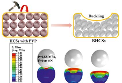 Buckled hollow carbon nanospheres (BHCSs) integrate several attractive properties desired for a variety of potential applications. However, the development of a feasible and simple method for preparing BHCS nanoparticles remains a great challenge. Herein, we present a facile strategy for fabricating monodisperse BHCSs via the compression of intact hollow carbon nanospheres (HCSs) with improved mechanical strength. The essence of our strategy lies in the successful preparation of robust HCSs that can sustain large mechanical deformation during compression, based on the introduction of polyvinylpyrrolidone in the synthesis of HCS templates. Both experiments and finite element analyses are conducted to probe the deformation mechanism of buckling, suggesting that the residual stress introduced by pyrolysis of precursors plays a predominant role in the buckling process. Furthermore, the use of BHCSs as high-performance supercapacitors is demonstrated. Our work provides important insights into the engineering of robust amorphous carbon nanomaterials by the template method and mechanical modulation and provides an innovative synthetic strategy for fabricating asymmetric hollow spheres with potential for a diversity of applications.