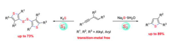 Cascade cyclization reactions of S3˙−in situ generated from S2− with 1,3-enynes for the chemoselective synthesis of 2,3,5-trisubstituted thiophenes and 3-thienyl disulfides controlled by sulfide salts are developed. These two protocols provide new, environment-friendly and simple strategies to construct 2,3,5-trisubstituted thiophenes and 3-thienyl disulfides via the formation of two and six C–S bonds, respectively.