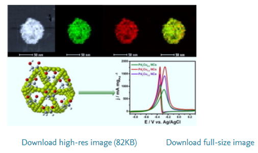 Mastery over the structure at nanoscale can efficiently tune the catalytic properties of catalysts, enabling great enhancement in electrocatalytic performance toward liquid fuel electrooxidation reactions. Herein, we demonstrate a facile one-pot method for the successful fabrication of binary PdCu nanocatalysts bounded with 3D open-structured nanocages, which show the advantages of high surface areas, facile mass/electron transport, and strong synergistic effect. Impressively, the resultant 3D open-structured PdCu nanocages (NCs) show large promotion in electrocatalytic performance toward ethanol oxidation reaction (EOR) with the mass activity of 1790.8 mA mg−1, being 3.3 times higher than that of commercial Pd/C (536.2 mA mg−1). Besides, the specific activity for EOR on PdCu NCs (7.7 mA cm−2) is also comparable to many Pt-based electrocatalysts, suggesting the dramatically improved electrocatalytic activity. The outstanding electrocatalytic performance of binary PdCu catalysts is attributed to the highly open 3D nanocage structure and strong electronic effect of Pd and Cu.