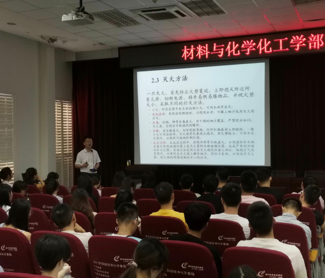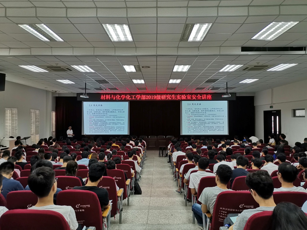 2019年9月8日上午,材化部360名研究生新同学济济一堂,在907号楼1101报告厅参加了实验室安全教育专题讲座。讲座由学部副主任朱健教授、实验室管理办公室主任朱利明老师主讲。