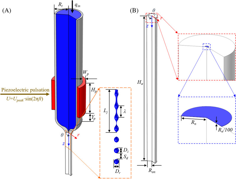 Abstract: Piezoelectric pulsation-driven glass nozzles are capable of generating monodisperse droplets through liquid jet breakup. Due to the lack of fundamental understanding of this process, how to ensure uniform droplet generation with a specified size for liquids with specific rheological properties remains unknown. In this work, the complete atomization process including phenomena in and outside of the nozzle has been described by a new multi-physics model, where the expensive in-nozzle simulation can be rigorously replaced by a semi-empirical relationship. This computationally efficient model allowed us to systematically and quantitatively explore the influence of different material and operating parameters on jet breakup. It was found unintuitively that the surface tension has negligible influence on droplet size and its distribution. The droplet size can be independent of the nozzle radius under the condition of a constant inflow rate. Moreover, a detailed guideline was established to achieve on-aim size control of the atomized droplets.