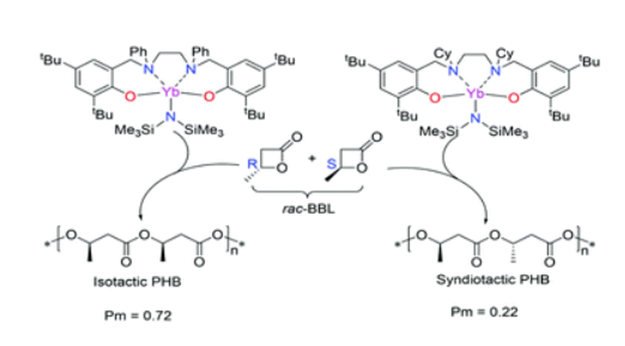 A series of novel salan-ligated rare-earth metal amide complexes were prepared and employed as initiators for the ROP of rac-β-butyrolactone (rac-BBL). Tuning the substituents on the N atoms of the ligand frameworks from aromatic groups to aliphatic groups results in switching tacticity from iso-tactic to syndio-tactic in rac-BBL polymerization.