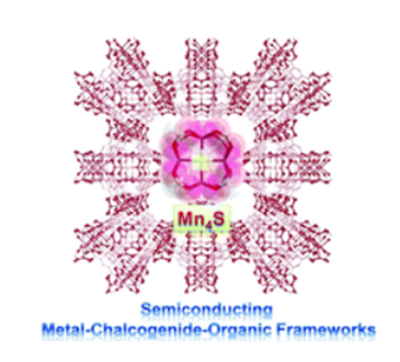 We demonstrated here a novel semiconducting metal-chalcogenide–organic framework (MCOF-89) with an optical bandgap through the unlikely assembly between a metal chalcogenide unit and carboxylic acid. The elusive metal-chalcogenide unit [Mn4(μ4-S)] with square-planar tetra-coordinated sulfur (sptS) is for the first time observed in MOFs.