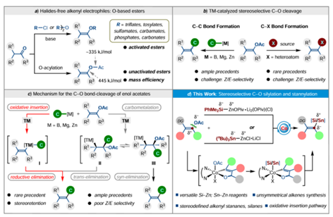 Facile formation of carbon-heteroatom bonds is a long-standing objective in synthetic organic chemistry. However, direct cross-coupling with readily accessible alkenyl acetates via inert C‒O bond-cleavage for the carbonheteroatombond construction remains challenging.Herewe report a practical preparation of stereoselective tri- and tetrasubstituted alkenyl silanes and stannanes by performing cobalt-catalyzed C‒O silylation and stannylation of alkenyl acetates using silylzinc pivalate and stannylzinc chloride as the nucleophiles. This protocol features a complete control of chemoselectivity, stereoselectivity, as well as excellent functional group compatibility. The resulting alkenyl silanes and stannanes show high reactivities in arylation and alkenylation by Hiyama and Stille reactions. The synthetic utility is further illustrated by the facile late-stage modifications of natural products and druglike molecules. Mechanistic studies suggest that the reaction might involve a chelation-assisted oxidative insertion of cobalt species to C‒O bond. We anticipate that our findings should prove instrumental for potential applications of this technology to organic syntheses and drug discoveries inmedicinal chemistry.