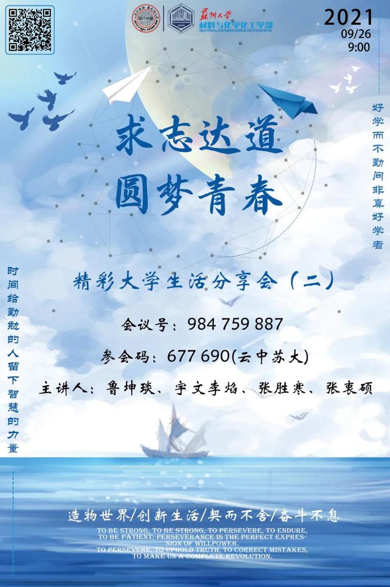 2021年9月26日09:00,苏州大学材料与化学化工学部入学教育之“求志达道,圆梦青春”——精彩大学生活分享会(二)于云中苏大线上平台举行。来自中国科学技术大学、香港中文大学和苏州大学的硕博学长学姐继续为21级分享他们的四年青春时光。