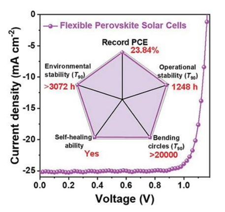 Flexible perovskite solar cells (pero-SCs) are the best candidates to complement traditional silicon SCs in portable power applications. However, their mechanical, operational, and ambient stabilities are still unable to meet the practical demands because of the natural brittleness, residual tensile strain, and high defect density along the perovskite grain boundaries. To overcome these issues, a cross-linkable monomer TA-NI with dynamic covalent disulfide bonds, H-bonds, and ammonium is carefully developed. The cross-linking acts as “ligaments” attached on the perovskite grain boundaries. These “ligaments” consisting of elastomers and 1D perovskites can not only passivate the grain boundaries and enhance moisture resistance but also release the residual tensile strain and mechanical stress in 3D perovskite films. More importantly, the elastomer can repair bending-induced mechanical cracks in the perovskite film because of dynamic self-healing characteristics. The resultant flexible pero-SCs exhibit promising improvements in efficiency, and record values (23.84% and 21.66%) are obtained for 0.062 and 1.004 cm2 devices; the flexible devices also show overall improved stabilities with T90 >20 000 bending cycles, operational stability with T90 >1248 h, and ambient stability (relative humidity = 30%) with T90 >3000 h. This strategy paves a new way for the industrial-scale development of high-performance flexible pero-SCs.