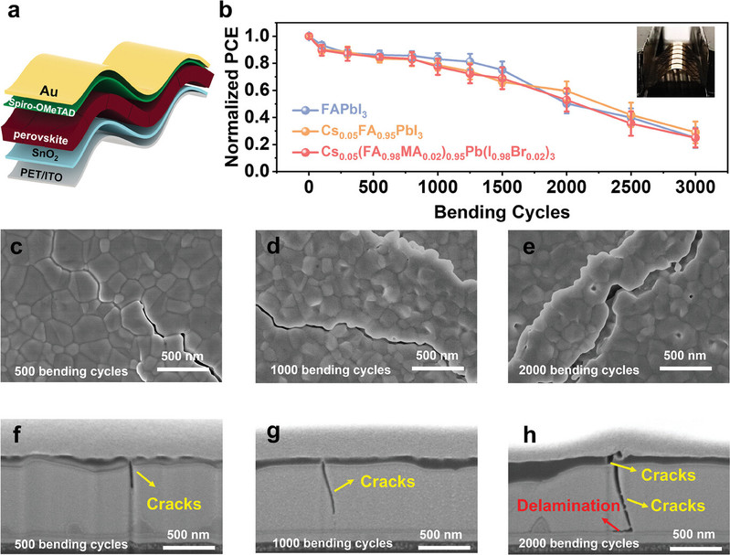 Abstract: Flexible perovskite solar cells (pero-SCs) have the potential to overturn the application scenario of silicon photovoltaic technology. However, their mechanical instability severely impedes their practical applicability, and the corresponding intrinsic degradation mechanism remains unclear. In this study, the degradation behavior of flexible pero-SCs is systematically analyzed under mechanical stress and it is observed that the structural failure first occurs in the polycrystal perovskite film, then extend to interfaces. To suppress the structural failure, pentaerythritol triacrylate, a crosslinked molecule with three stereoscopic crosslink sites, is employed to establish a 3D polymer network in both the interface and bulk perovskite. This network reduced the Young's modulus of the perovskite and simultaneously enhanced the interfacial toughness. As a result, the formation of cracks and delamination, which occur under a high mechanical stress, is significantly suppressed in the flexible pero-SC, which consequently retained 92% of its initial power conversion efficiency (PCE) after 20 000 bending cycles. Notably, the flexible device also shows a record PCE of 24.9% (certified 24.48%).