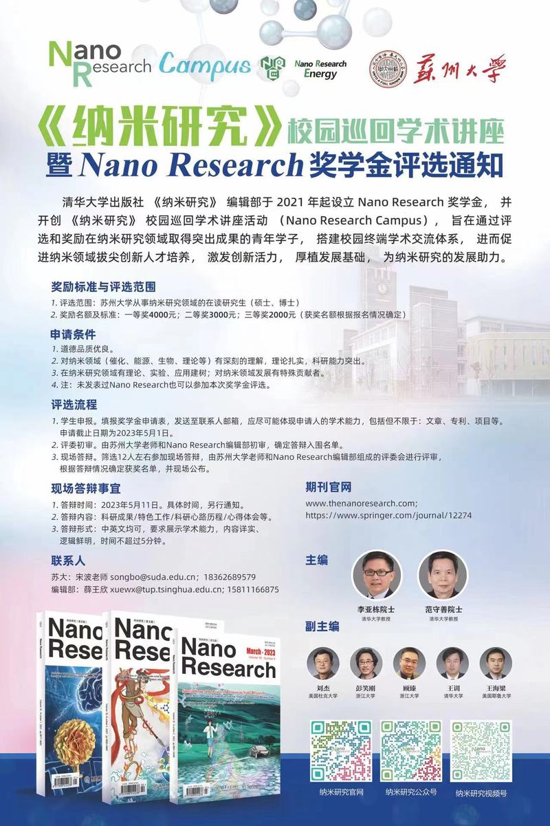 《纳米研究》校园巡回学术讲座暨Nano Research 奖学金评选通知