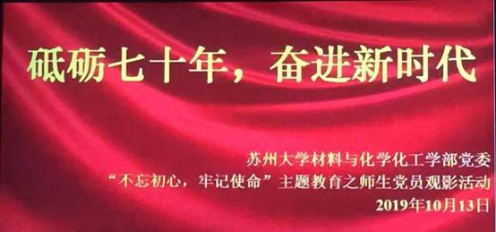10月13日下午,材化部党委教工党员、全体学生党员、发展对象以及入党积极分子共计四百余人在独墅湖影剧院一号厅集中观看了电影《我和我的祖国》。电影选取了新中国成立以来的七个重要历史时刻,讲述了普通人与祖国大事件息息相关的经历。全片以小见大,用普通人的先进事迹教育全体观影党员在日常工作学习中要保持党员先进性,发挥先锋模范作用,增强自我净化、自我完善、自我革新、自我提升的能力,永葆共产党人的政治本色、蓬勃生机和旺盛活力。