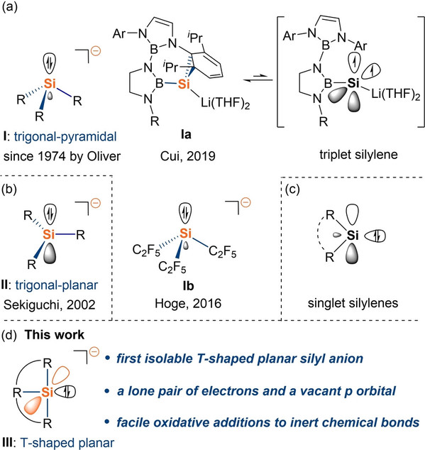 Abstract: Silyl anions have garnered significant attention due to their synthetic abilities. However, previously reported silyl anions have been limited to either trigonal-pyramidal or trigonal-planar geometries, which confine them primarily as nucleophiles in substitution reactions. Herein, we report the isolation of the unprecedented T-shaped planar silyl anion salt 2 by employment of a geometrically constrained triamido pincer ligand. Theoretical calculations disclosed that the silicon centre in 2 possesses both a lone pair of electrons and an empty 3pz orbital. In addition to nucleophilic substitution reactions with Ph3PAuCl and W(CO)6, 2 readily undergoes oxidative additions with CO2 and 2,6-dimethylphenylisonitrile at room temperature. Furthermore, under mild conditions, compound 2 cleaves Csp2−H, Csp2−H, and H−H bonds in 1,2,4,5-tetrafluorobenzene, an intramolecular iPr group, and dihydrogen, representing the first examples of C−H and H−H activations mediated by a silyl anion, respectively. This work unveils new reactivity of silyl anions owing to the non-classical geometry and electronic structure.