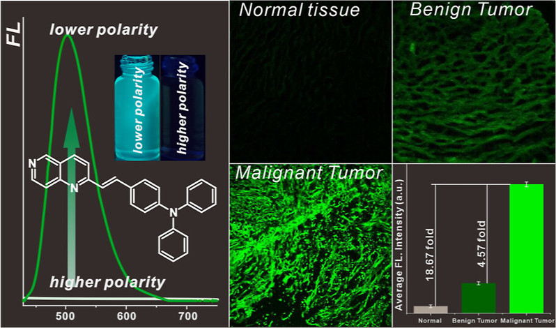 Abstract: Cancer is a genetic disorder caused by the long-term interaction of many factors, which has become the most important factor to take away human health; therefore, it is essential to develop a more efficient and sensitive cancer detection technology. This study developed two polarity sensitive probes 1a and 1b based on a 1,6-naphthyridine moiety linked to different targeting groups by vinyl as the π bridge. As the solvent polarity decreased, the emission wavelength of probes 1a and 1b experienced a blue shift, resulting in a significant enhance in fluorescence intensity by 135-fold and 53-fold, respectively, and a good linear relationship between Fmax of probes 1a and 1b and Δf was established with high correlation coefficients. Furthermore, probes 1a and 1b exhibited large Stokes shifts, high photostability, and low cytotoxicity, successfully targeting intracellular lipid droplets and mitochondria. Fluctuation in polarity was detected by real-time changes in fluorescence intensity of probes in lipid droplets and mitochondria. Moreover, probe 1b was capable of real-time monitoring mitochondrial polarity during starvation or rapamycin-induced autophagy. It was worth standing out 1a and 1b could distinguish normal cells from cancer cells, and then the probes also were successfully applied for imaging to differentiate between human normal tissues and cancerous tissues, with the fluorescence intensity of malignant tumor tissues being 15.4–19.9 folds higher than that of normal tissues and 5.3–7.2 times higher than that of benign tumor tissues. Therefore, this research offers potential applications for cancer diagnosis.