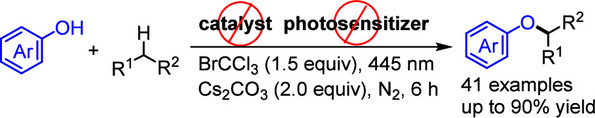 Abstract: The visible-light induced cross-dehydrogenative coupling of C(sp3)–H bonds with phenols using BrCCl3 to give aryl alkyl ethers has been achieved under transition-metal- and photocatalyst-free conditions. This operationally simple and mild protocol has a broad substrate scope, and was applied to the modification of drug molecules and on a gram-scale synthesis. The phenolate ion functions as both a substrate and photosensitizer, and BrCCl3 serves as the oxidant and hydrogen atom transfer (HAT) agent.