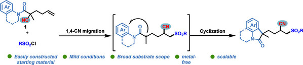 Abstract: A visible-light-induced trifunctionalization of unactivated alkenes for building functionalized oxindoles through a radical cyano migration strategy is reported. This transformation employs a tandem alkene sulfonylation-initiated cyano migration/cyclization cascade process. This strategy features stable and easily accessible substrates, mild reaction conditions, metal-free catalysts, and the capability of late-stage functionalization.