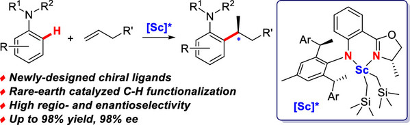 Abstract: The enantioselective C–H addition of anilines to alkenes represents an ideal protocol for the synthesis of chiral aromatic amines in terms of step- and atom-economy. However, this field remains predominantly unexplored. Herein, a series of newly designed bulky chiral anilido-oxazoline ligand precursors were synthesized, and the corresponding rare-earth metal alkyl complexes were obtained successfully. The resultant scandium complexes exhibit high regioselectivity for the ortho-C–H addition of tertiary anilines to unactivated alkenes, providing a wide range of chiral alkylated anilines in high yields (up to 98% yield) with excellent enantioselectivity (up to 98% ee). Moreover, the addition products can be easily converted into biorelevant derivatives and pharmacophore-containing skeletons.