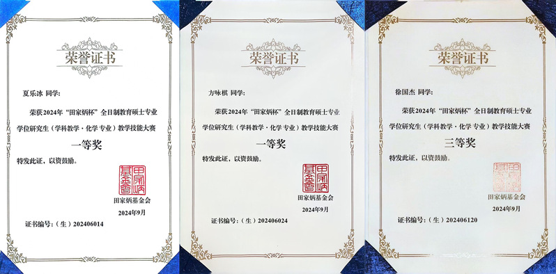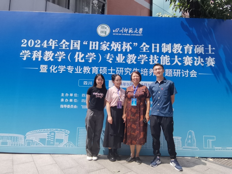 9月6至8日,全国“田家炳杯”全日制教育硕士学科教学(化学)专业教学技能大赛在四川师范大学举行,材料与化学化工学部2023级学科教学(化学)专业的夏乐冰、方咏棋、徐国杰三位同学在初赛中脱颖而出,晋级参加此次比赛。在王伟群、任志刚、刘洋三位老师的指导下,同学们刻苦训练,经过激烈的决赛,最终夏乐冰、方咏棋获一等奖,徐国杰获三等奖,王伟群教授获优秀指导教师称号。