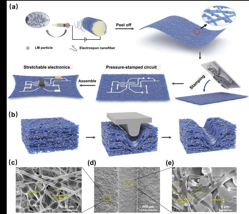 可拉伸电子产品在可穿戴设备、软机器人、人机界面和生物电子设备中有广泛应用。传统刚性导体可以通过弯曲和皱纹设计等方法整合到弹性材料中,但其固有的刚性会影响长期使用的稳定性。相较之下,镓基液态金属(LM)具备高导电性和变形能力,但电路制造过程复杂且与聚合物界面兼容性差。为解决上述问题,严锋团队通过对液态金属微粒及纳米纤维尺寸进行精准调控,并将压印技术和液态金属复合纳米纤维膜相结合,实现了对拥有高分辨率、高稳定性和高透气性电路的灵活且定制化制备。