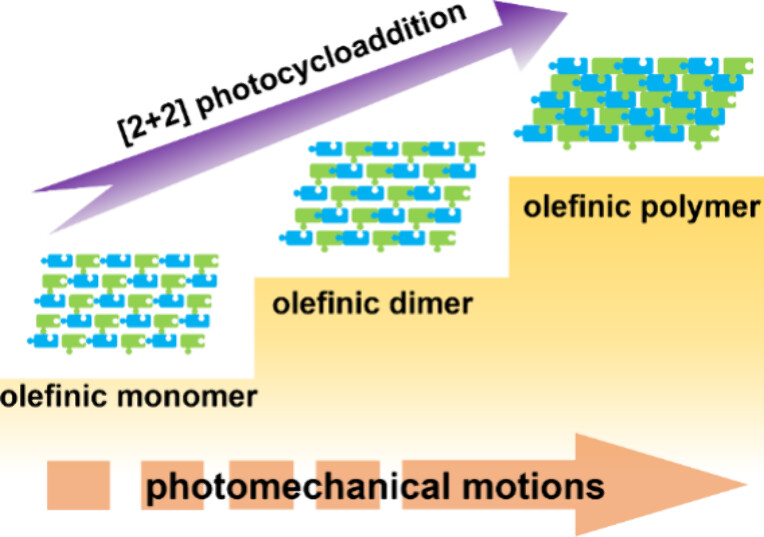 Abstract: Controlling the packing of olefinic molecules in crystals is essential for triggering solid-state [2 + 2] photocycloaddition reactions and the synthesis of photocontrolled smart materials. Herein, we report the stepwise photodimerization-triggered photopolymerization of two triene coordination polymers (CPs), {[Zn(2-BBA)2(tpeb)]·0.5CH3CN}n (1, 2-HBBA = 2-bromobenzoic acid, tpeb = 1,3,5-tri-4-pyridyl-1,2-ethenylbenzene) and {[Zn(3-BBA)2(tpeb)]·CH3CN)}n (2, 3-HBBA = 3-bromobenzoic acid). Upon irradiation with 420 nm light, each pair of closely packed and parallel olefinic bonds in 1 undergoes a [2 + 2] cycloaddition reaction, which connects two adjacent Z-shaped chains into a ladder-like coordination chain [Zn(2-BBA)2(bpbdpvpcb)0.5]n (1a, bpbdpvpcb = 1,3-bis(4-pyridyl)-2,4-bis(3,5-di(2-(4-pyridyl)vinyl)phenyl]cyclobutene) through single-crystal to single-crystal (SCSC) transformation. After photodimerization from 1 to 1a has occurred, the olefinic bonds that were initially distant are brought in close enough proximity to meet the requirements for a subsequent [2 + 2] cycloaddition reaction. Upon further light irradiation, the neighboring bpbdpvpcb ligands in 1a experience a SCSC photopolymerization based on [2 + 2] photocycloaddition and transform into poly-3b,4,5,5a,8b,9,10a-octahydro-4,5,9,10-tetrapyridyl-2,7-di(2-(4-pyridyl)vinyl)dicyclobuta[e,l]-pyren (poly-otpdpvdcbp). 2 showed similar structural changes under UV light illumination. Under light exposure, single crystals of 1 and 2 with different morphologies exhibit bending, cracking, and jumping photomechanical motions. The composite film (1-PVA) engineered by dispersing crystalline particles of 1 in poly(vinyl alcohol) (PVA) displays interesting light-wavelength-dependent photomechanical motions and can perform photodriven swimming on a liquid surface. This work provides a useful and promising approach to enable photodimerization of those photoinactive olefin pairs embedded in CPs and opens a new route to synthesize organic polymers by using olefinic CP platforms.
