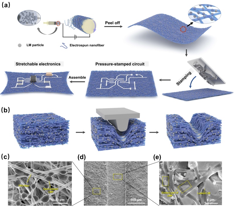 Pressure-stamped stretchable electronics using a nanofibre membrane containing semi-embedded liquid metal particles