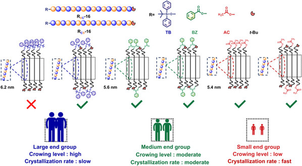 Abstract: Discrete oligomers are ideal candidates for the investigation of the crystallization behaviors of polymers since the molecular weight distribution and the precision of molecular structures play a crucial role in the crystallization behaviors of polymers. We precisely synthesize discrete alternative co-oligomers (o(γ-BL-alt-ε-CL)s) with different end groups based on ε-caprolactone (ε-CL) and γ-butyrolactone (γ-BL) as monomers using an iterative exponential growth (IEG) strategy and systematically study the crystallization and melting behaviors of the o(γ-BL-alt-ε-CL)s with precise monomer sequence. The roles that the end group plays in the crystallization and melting of co-oligomers are highlighted. The o(γ-BL-alt-ε-CL)s with different end groups (tert-butyldiphenylsilyl, benzoyl, acetyl) crystallize in an extended-chain conformation. Observation on the decrease of the crystallization rate of co-oligomers with the increase of the size of the end groups is associated with the slow dynamics or slow relaxation of co-oligomer chains with the large end group. The melting–recrystallization during the heating process for the o(γ-BL-alt-ε-CL)s with small end group is attributed primarily to the reduced steric hindrance effect. For the o(γ-BL-alt-ε-CL)s with large end groups, the rearrangement of co-oligomer chains is substantially hindered by steric effects, which lead to a significant suppression of the melting–recrystallization.