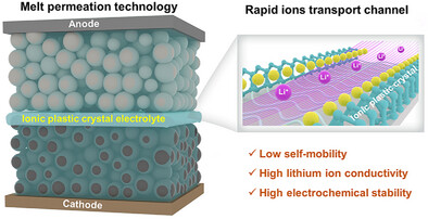 Abstract: The practical use of all-solid-state batteries (ASSBs) is hindered by the intractable electrolyte/electrode interfacial resistance and discontinuous ion transport networks within electrodes. Ionic plastic crystals offer a potential solution to these challenges due to their melt-permeable properties to the electrodes. However, their limited ionic conductivity restricts their application. Here, we propose a design principle for solid-state electrolytes based on an electric field-induced strategy by using ionic plastic crystals with low self-migrating and high conductivity toward target ions. Through the external potential difference, an ordered internal electric field is generated within the ionic plastic crystal-based solid-state electrolytes (IPCEs), which mitigates the coordination limitations of anions on target ions to facilitate rapid ion conduction. The prepared IPCE demonstrates high ionic conductivity (1.08 × 10−3 S cm−1 at 25 °C) and a Li+ transfer number (0.77), enabling the application of ASSBs over a wide temperature range (from 0 to 60 °C). Furthermore, the assembled Li||LiNi0.8Co0.1Mn0.1O2 ASSBs exhibit stable cycling, maintaining 97.5% capacity retention after 500 cycles at 25 °C. This work provides a fresh perspective on the practical application of ASSBs, highlighting the potential of IPCEs in enhancing battery performance.
