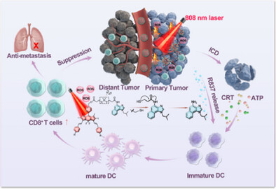 Abstract:Light-activatable prodrugs have been applied in precision cancer therapy because of their spatiotemporal controllability and minimal toxic side effects. However, the reported prodrugs were limited by the ultraviolet and visible light regions, which seriously restricted their application in deep tissues. Developing a near-infrared (NIR) light-activatable release system remains a great challenge. Herein, the 808 nm light-activatable prodrugs were constructed with imiquimod (R837) and NIR boron dipyrromethene (BODIPY) via a reactive oxygen species (ROS)-cleavable linker for photoimmunotherapy of “cold” cancer. ROS produced by BODIPY could cleave the linker under 808 nm laser irradiation, and R837 was released spatiotemporally at the tumor site. The combination of the immune response produced by R837 and immunogenic cell death caused by phototherapy significantly potentiated adaptive antitumor immunity and enhanced cytotoxic CD8+ T cell infiltration for tumor metastasis and distant tumor inhibition. This work provides an effective NIR light-activatable controlled release system for cancer immunotherapy and metastasis suppression.