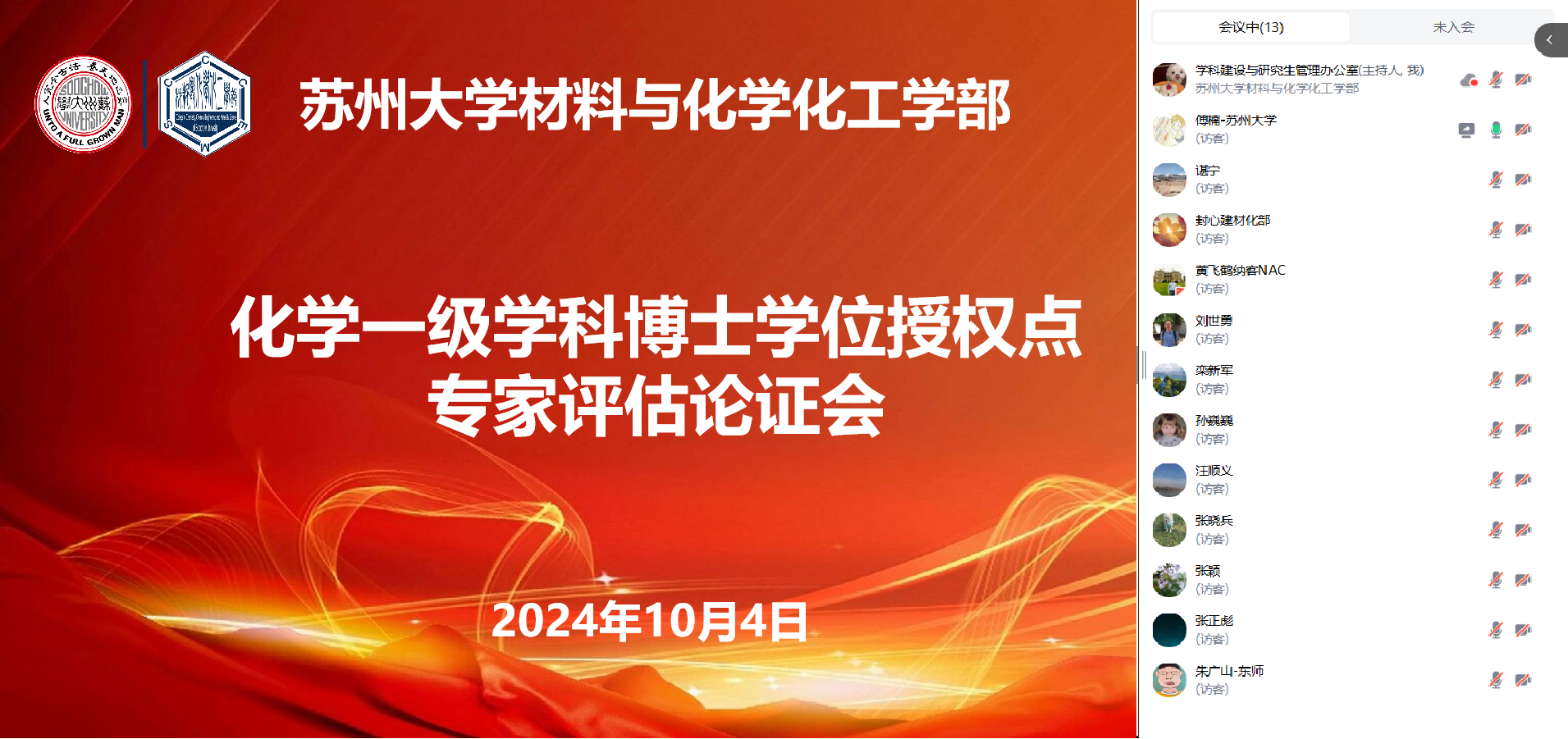 为进一步提升学位授权点建设水平,全面评估学位点建设成就、师资力量、科研水平及人才培养质量,材料与化学化工学部于10月4日召开了苏州大学化学一级学科博士学位授权点周期性合格评估线上会议。