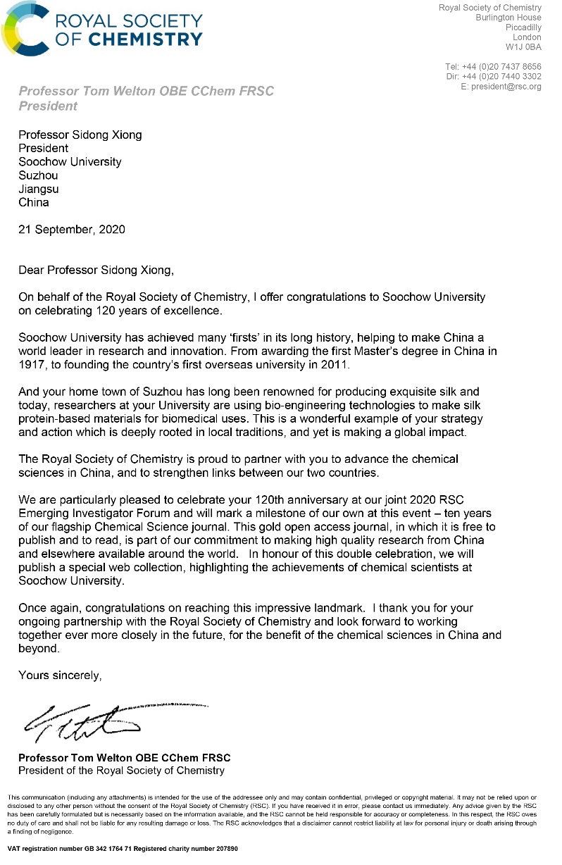 为庆祝苏州大学120周年校庆以及英国皇家化学会旗舰期刊Chemical Science创刊十周年,英国皇家化学会主席Tom Welton先生特致信苏州大学校长熊思东以示祝贺。
