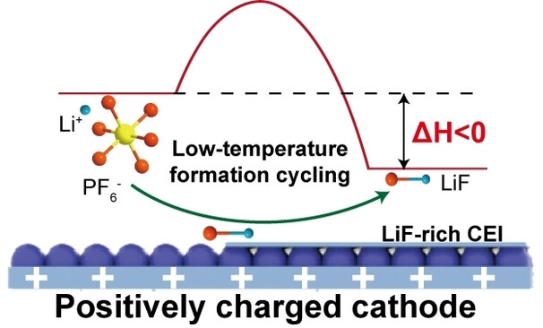 Abstract: Formation of LiF-rich cathode-electrolyte interphase is highly desirable for wide-temperature battery, but its application is hindered by the unwanted side reactions associated with conventional method of introducing fluorinated additives. Here, we developed an additive-free strategy to produce LiF-rich cathode electrolyte interphase (CEI) by low-temperature formation cycling. Using LiNi0.33Mn0.33Co0.33O2 as a model cathode, the atomic ratio of LiF in the CEI formed at −5 °C is about 17.7%, enhanced by ~550% compared to CEI formed at 25 °C (2.7%). The underlying mechanism is uncovered by both experiments and theoretic simulation, indicating that the decomposition of LiPF6 to LiF is transformed into spontaneous and exothermic on positively charged cathode surface and lowering the temperature shift chemical equilibrium towards the formation of LiF-rich CEI. Superior to conventional fluorinated additives, this approach is free from unwanted side reactions, imparting batteries with both high-temperature (60 °C) cyclability and low-temperature rate performance (capacity enhanced by 100% at 3C at −20 °C). This low-temperature formation cycling to construct LiF-rich CEI is extended to various cathode systems, such as LiNi0.8Mn0.1Co0.1O2, LiCoO2, LiMn2O4, demonstrating the versatility and potential impact of our strategy in advancing the performance and stability of wide-temperature batteries and beyond.