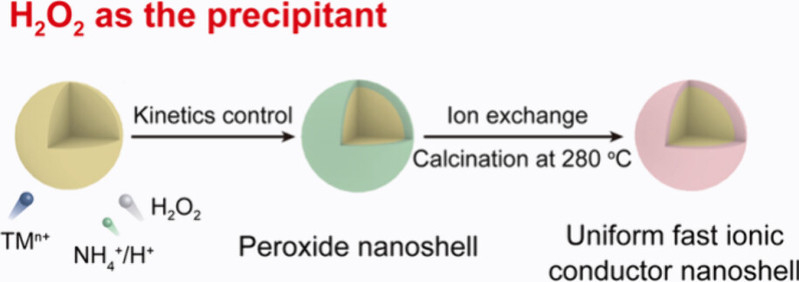 Abstract: Constructing a uniform coating of alkali metal-containing fast ionic conductors is crucial for realizing multifunctional responses and functionalities. However, the uncontrolled coprecipitation of alkali and transition metal ions, stemming from their significant difference in reactivity, poses a significant challenge in pursuing homogeneous and continuous nanoshells for fast ionic conductors. Here, we report a versatile peroxide-based kinetics-controlled coating approach for constructing alkali metal-containing fast ionic conductors using LiNbO3 as a proof-of-concept. Hydrogen peroxide (H2O2) was employed as an innovative precipitant, and the deposition kinetics could be precisely tuned by adjusting the pH value of the solution to facilitate the coprecipitation of the transition metal and ammonium/hydrogen ions. The latter could subsequently be exchanged with lithium ions and transformed into uniform LiNbO3 nanoshells after low-temperature annealing (280 °C). The obtained LiNbO3 coating layers are continuous, thickness-tunable, and exhibit significantly higher ionic conductivity, 2 orders of magnitude greater than conventional counterparts. This enhancement enables solid-state batteries with excellent cycling and rate performance. Furthermore, this method is extendable to various alkali metal-based (Li, Na, and K) fast ionic conductor nanoshells, injecting new vitality into the advanced applications of fast ionic conductors in various battery systems.