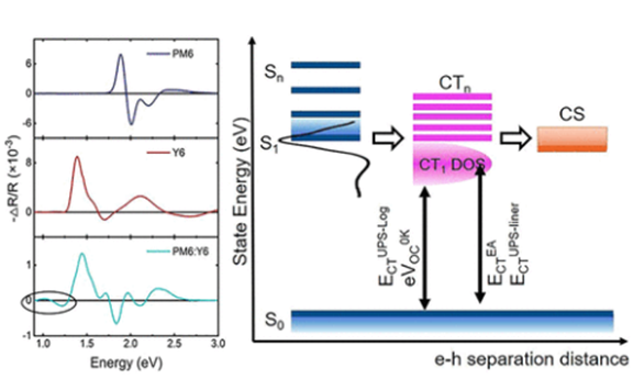 For organic solar cells (OSCs), the charge generation mechanism and the recombination loss are heavily linked with charge transfer states (CTS). Measuring the energy of CTS (ECT) by the most widely used technique, however, has become challenging for the non-fullerene-based OSCs with a small driving force, resulting in difficulty in the understanding of OSC physics. Herein, we present a study of the PM6:Y6 bulk heterojunction. It is demonstrated that electro-absorption can not only reveal the dipolar nature of Y6 but also resolve the morphology-dependent absorption signal of CTS in the sub-bandgap region. The device with the optimum blending weight ratio shows an ECT of 1.27 eV, which is confirmed by independent measurements. Because of the charge transfer characteristics of Y6, the charge generation at PM6:Y6 interfaces occurs efficiently under a small but non-negligible driving force of 0.14 eV, and the total recombination loss is as low as 0.43 eV.