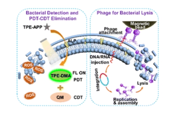 Abstract: Accurate identification and elimination of multi-bacterial infections are critical due to their significant threat to human health, the complexity of synergistic pathogenic mechanisms and their pivotal role in accelerating antibiotic resistance. Here, we developed a multiplex phage-based fluorescence assay using encoded magnetic nanobeads and multifunctional alkaline phosphatase (ALP)-activatable aggregation-induced emission (AIE) probes for synchronously sensitive detection and efficient elimination of multiple pathogenic bacteria. Preselected phages were covalently conjugated to magnetic nanobeads to form a phage cocktail recipe, enabling specific and precise separation of target bacteria from mixed samples. The high expression of ALP within bacteria triggers enzymatic cleavage of AIE probes, forming luminescent aggregates for sensitive detection, while quinone methide species generated in situ exhibit strong chemodynamic and photodynamic activities for enhanced bacterial killing. By combining the inherent bacteriolytic activity of phages on magnetic nanobeads, a significantly boosted efficacy in killing multi-bacterial infections was achieved. Both in vitro and in vivo experiments demonstrated that this integrated system enables sensitive identification of multi-bacterial infections and augmented antibacterial efficiency, offering a novel strategy for the real-time, precise diagnosis and treatment of multi-bacterial infections.
