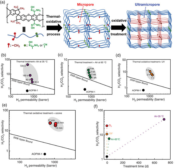 Abstract: Efficient H2/CO2 separation using membrane technology is crucial for energy-efficient hydrogen production. However, due to the similar transport rates of the two gases, existing polymeric membranes face significant challenges in H2/CO2 separation. In this work, the microporous structure of polymer membranes is designed by a two-step collaborative cross-linking strategy to achieve ultra-permeable mixed-gas H2/CO2 separation, where rigid molecular cross-linking sites are incorporated into the polymer chains to stabilize the pore structure and the flexible molecular cross-linking sites are subsequently incorporated to finely tune the pore size of the membranes. Through this two-step collaborative cross-linking-based structure reconstruction (TSC-SR) strategy, a membrane derived from an amidoxime-functionalized polymer precursor achieves a H2 permeability of 1117.4 barrer and a H2/CO2 selectivity of 34.1, and a membrane derived from a nitrile-functionalized polymer precursor achieves a H2 permeability of 237.0 barrer and a H2/CO2 selectivity of 107.3. The performance of the two membranes is superior to all reported polymer membranes and even surpasses most inorganic membranes. The work not only demonstrates that polymeric membranes can effectively separate H2/CO2 but also represents a significant advancement in the design of polymeric membranes for gas separation.