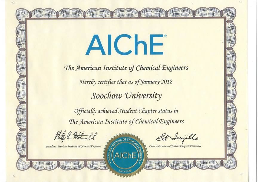 经过半年多的筹备和申请,并经由美国韦恩州立大学Yinlun Huang教授的引荐,苏州大学材料与化学化工学部美国化学工程师协会学生分会(American Institute of Chemical Engineers Student Chapter)于近期正式成立。美国化学工程师协会(AIChE) 成立于1908年,是全世界最著名的由化学工程师组成的学术团体,其45000个会员遍布全球90个国家。AIChE学生分会为化学工程及其相关专业的本科生和研究生提供了一个相互交流和了解当今化学工程领域前沿技术的平台,使同学们能在成为优秀的化学工程师的道路上获得一些必要的帮助和支持。