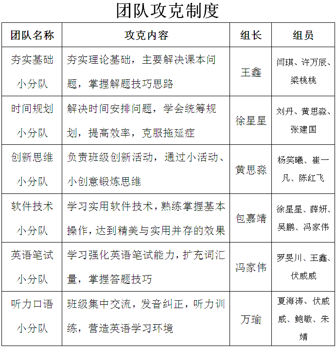逐步落实“团队攻克”学习制度(详见图表3),鼓励学有余力的同学带领其他同学进行团体式学习,优化学习方式,提高学习动力。