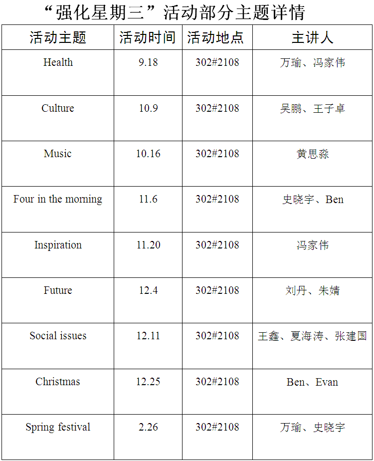 作为强化班,全英文教学是我班的特色。最值得一提的是班级最新推出的品牌活动“强化星期三”(详见图表1)。每周三,班级都会在晚自习时间段举办该活动。同学们按照每周确定的主题进行交流讨论,整个活动是全英文的,对同学们的英语是很大的挑战,同时也是对英文学习的一种促进与强化。同学们可以自己根据主题选取一些素材,如TED视频、文章杂志、教学文献等多种媒体形式,来进行探讨与深化交流,偶尔也会邀请外国小伙伴参与其中。同时,同学也可以通过“强化星期三”来解决学习上的问题,学习必要的软件使用技术,如Prezi软件和分享最新的时尚影视信息等等。这种新颖的活动形式以及创新的学习方法获得了同学们的好评,同时也得到老师的支持与推广。相信该活动会成为强化班的品牌活动,为同学们提高英语能力,发散思维,开拓视野,了解世界提供了平台。