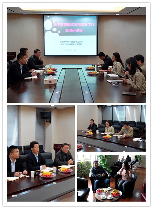 3月19日上午,苏州大学材料与化学化工学部学生管理模式与创就业工作交流研讨会在苏州大学独墅湖校区907幢1222会议室进行。学部党委副书记、副主任王美珠、学工办主任司马文华、团委书记黄郁健、学工办副主任俞仁琰与来访的苏州工业园区职业技术学院学工部主任陆伟,信息工程系党支部书记刘启明、团委书记张正余共同交流探讨。