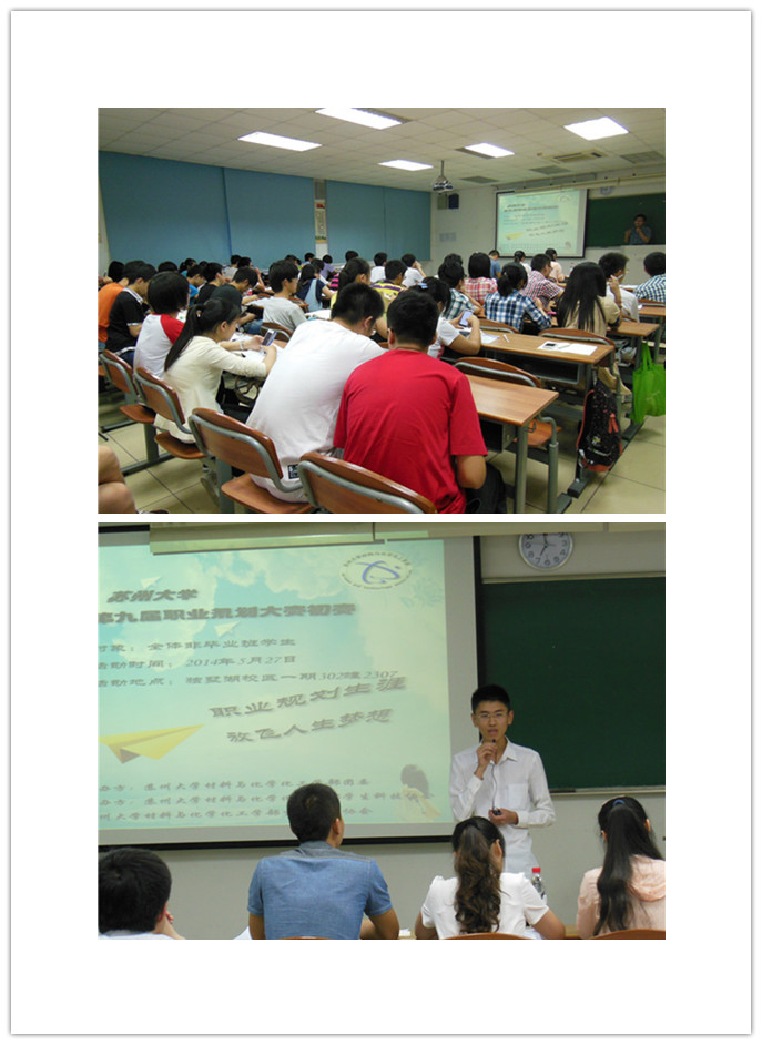 014年5月27日晚,由材料与化学化工学部团委、学生科技协会与生涯发展协会联合举办的学部2014职业生涯规划大赛在苏州大学独墅湖校区一期公教楼302幢2307室举行。曾获第八届江苏省职业生涯规划大赛十佳规划之星奖项的文学院11级汉语言师范专业陈妙林、原学部学生科技协会理事长张小宝、社团联合会副主席吴琳担任比赛评委。本次活动旨在让低年级学生对职业生涯有更好的认识与规划,能够明确目标,调整方向,不断进步。