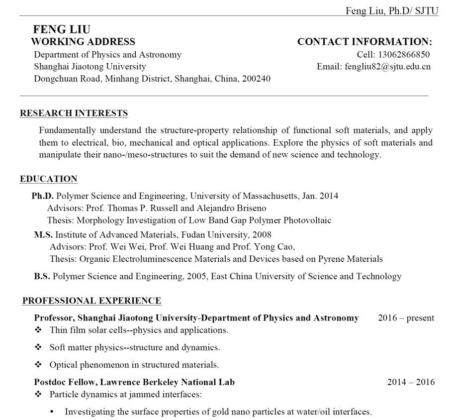 Dr. Feng Liu obtained Ph.D in polymer science and engineering from University of Massachusetts in 2014 under the supervision of Professor Thomas P. Russell, focusing on understanding the non-equilibrium structure of blended thin films. He is currently a distinguished research fellow in Department of Physics and Astronomy in Shanghai Jiaotong University. His expertise includes polymer science, synchrotron x-ray and neutron techniques and thin film electronic devices. He has coauthored more than 140 research papers and book chapters. His research interests include soft materials, energy science, biomaterials and surface/interface sciences. In this talk, Feng will focus on the morphology characterization of functional soft materials, especially bulk heterojunction (BHJ) photovoltaic blends. Basics of synchrotron structure characterization methods, including hard x-ray diffraction and soft x-ray scattering will be reviewed. The dynamic characterization of structure formation using in situ x-ray scattering/diffraction methods will also be discussed. The discussion will be talking about material crystallization, kinetics of phase separation and phase construction. It would be of interest to audience who work on conjugated polymers/molecules (both chemistry and physics), material blends and general functional soft materials.