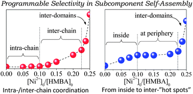 We describe the programmable selectivity of intra-/inter-chain coordination in the subcomponent self-assembly of a primary amine based block copolymer. A well-defined poly(6-aminohexylmethacrylamide hydrochloride)-block-poly(N-2-hydroxypropylmethacrylamide) (PHPMA-b-PAHMA) was synthesized via visible light activated aqueous RAFT polymerisation at 25 °C. The conjugation of 2-hydroxy-5-methoxybenzaldehyde (HMBA) in the absence or presence of small fractions of the nickel ion complex was monitored using 1H NMR and UV spectroscopy. Subcomponent self-assembly and the programmable selectivity of intra-/inter-chain coordination were studied using dynamic light scattering and 1H NMR. The results demonstrated that the coordinated HMBA was much more reactive than the free HMBA, which promoted the collapse and hydrophobic association of polymer chains and thus brought about the autocatalysis of imine formation inside the collapsed “hot spots”. The polymer chains progressively assembled into narrowly-distributed nanoparticles on adding small fractions of NiII(HMBA)2 rather than autopoietically splitting into smaller ones, as observed on adding pure HMBA. More importantly, the diversity of subcomponent self-assembly and solubility of aggregates originated from the programmable selectivity of intra-/inter-chain coordination.