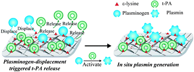 A new tissue plasminogen activator (t-PA) releasing concept based on a unique protein-displacement triggering mechanism is reported. This concept takes advantage of the fact that plasminogen has higher affinity than t-PA for surface bound lysine. t-PA bound to lysine-modified materials through specific interactions is thus displaced from the surface (released) by plasminogen when in contact with plasma. The concept was investigated using a lysine-modified polyurethane (PU) material in the form of fibrous mats fabricated by electrospinning. The mats are of high surface area to volume ratio and are effectively porous due to fiber entanglement. They were successively modified with poly(2-hydroxyethyl methacrylate) (PHEMA) and lysine, such that the ε-amino and carboxyl groups were free (ε-lysine). These materials were shown to be significantly resistant to nonspecific protein adsorption and to take up large amounts of t-PA through specific interactions with lysine residues. The role of plasminogen-mediated displacement in t-PA release was fully confirmed, and efficient clot lysis by the t-PA loaded materials was demonstrated in an in vitro plasma assay. Release of t-PA by plasminogen displacement endows the t-PA-loaded materials with dual mechanisms for clot-lysis, i.e. by t-PA released from the material to generate plasmin in the fluid phase and by plasmin generated on the surface.