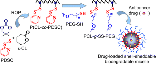 Pyridyl disulfide-functionalized cyclic carbonate (PDSC) monomer was obtained in four straightforward steps from 3-methyl-3-oxetanemethanol and exploited for facile preparation of functional poly(ε-caprolactone) (PCL) containing pendant pyridyl disulfide (PDS) groups via ring-opening copolymerization with ε-caprolactone. The results showed that PDS-functionalized PCL polymers were prepared with controlled molecular weights and functionalities. The exchange reaction between PDS-functionalized PCL and thiolated poly(ethylene glycol) (PEG-SH) at a PEG-SH/PDS molar ratio of 2/1 afforded PCL-g-SS-PEG graft copolymers in high yields. The dynamic light scattering (DLS) analyses showed that PCL-g-SS-PEG copolymer self-assembled into micelles with a diameter of 110–120 nm and a low polydispersity (PDI) in phosphate buffer (pH 7.4, 10 mM). PCL-g-SS-PEG micelles while sufficiently stable under physiological conditions were prone to rapid shell shedding and aggregation under a reductive condition. Doxorubicin (DOX) was loaded into PCL-g-SS-PEG micelles with a decent drug loading content of 10.1 wt %. Notably, in vitro release studies revealed that ca. 82.1% DOX was released in 12 h under a reductive environment analogous to that of the intracellular compartments such as cytosol and the cell nucleus whereas only ca. 17.5% DOX was released in 24 h under nonreductive conditions. Confocal microscopy observation indicated that DOX was delivered into the nuclei of HeLa cells following 8 h incubation with DOX-loaded PCL-g-SS-PEG micelles. MTT assays in HeLa cells demonstrated that DOX-loaded PCL-g-SS-PEG micelles retained high antitumor activity with low IC50 (half-maximal inhibitory concentration) of 0.82–0.95 μg DOX equiv/mL while blank PCL-g-SS-PEG micelles were nontoxic up to a tested concentration of 1.0 mg/mL. This study presents a versatile and controlled synthesis of PDS-functionalized biodegradable polymers and reduction-sensitive biodegradable graft copolymer micelles that are of particular interest for active intracellular drug release.