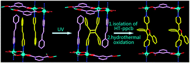 The SCSC transformation of a 1D polymer [Cd(1,3-bdc)(4-spy)2]n produced a 2D polymer [Cd(1,3-bdc)(4-spy)(HT-ppcb)0.5]n through the [2+2] photodimerization reaction. Hydrothermal reactions of HT-ppcb with CdCl2, 1,3-H2bdc and H2O2 afforded another 2D polymer {[Cd(H2O)(1,3-bdc)(bpbpf)]·H2O}n in which HT-ppcb underwent in situ oxidation to form a unique furan-based ligand bpbpf.