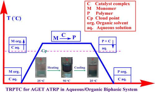 A novel strategy via thermoregulated phase-transfer catalysis (TRPTC) to separating catalyst in aqueous/organic biphasic system has been successfully established in a copper-mediated activators generated by electron transfer for atom transfer radical polymerization (AGET ATRP) of methyl methacrylate (MMA), using a thermoresponsive PEG-supported dipyridyl ligand (PSDL) as the ligand and an alkyl pseudohalogen 2-cyanoprop-2-yl 1-dithionaphthalate (CPDN) as the initiator. The catalyst complex can transfer into the organic phase from initial catalyst aqueous solution at the reaction temperature (90 °C) to catalyze the homogeneous polymerization of MMA and then retransfer into the aqueous solution from the organic phase to separate the catalyst from the polymerization solution once cooled to room temperature (25 °C) while remaining well-controlled product (PMMA) in organic layer. In addition, the polymerization can be conducted in the presence of a limited amount of air, which not only does not sacrifice the controllability over polymerization but also can recycle the catalyst just by a simple change of the temperatures effectively.