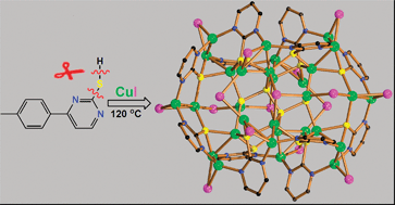 The Cu(I)-mediated C–S bond cleavage of 5-methyl-4-(p-tolyl)pyrimidine-2-thiol (mtpmtH) gave one 30-nuclear cluster [Cu30I16(mtpmt)12(μ10-S4)], one polymeric complex [(bmtpms)Cu-(μ-I)]n and one tetranuclear complex [(bmptmds){Cu(μ-I)}2]2; the 30-nuclear cluster displayed excellent catalytic performances in the coupling reactions of N-heterocycles and arylboronic acids and could be recycled and reused.