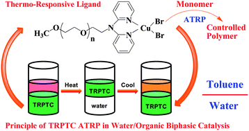 The concept of thermoregulated phase-transfer catalysis (TRPTC) for an aqueous–organic biphasic system was applied in Cu(II)-mediated atom transfer radical polymerization (ATRP) of methyl methacrylate (MMA). Herein, activators generated by electron transfer (AGET) ATRP was used to establish the TRPTC ATRP system using 2-cyanoprop-2-yl 1-dithionaphthalate (CPDN) as an alkyl pseudohalide initiator, CuBr2 as the catalyst and ascorbic acid (AsAc) as the reducing agent. It used a thermo-responsive monofunctional ligand including the dipyridyl group (MPEG-DPA), which enabled the transfer of the catalyst complex into the organic phase from the aqueous phase upon heating, thus achieving homogeneous polymerization; and the catalyst complex could retransfer into the aqueous phase from the organic phase thereby realizing the separation and recycling of the catalyst complex upon cooling. Well-defined PMMA with controlled molecular weight and narrow molecular weight distribution could be obtained by TRPTC ATRP. Furthermore, the polymerization of MMA could be successfully carried out even when the amount of catalyst was reduced to the ppm level. The features of controlled/“living” radical polymerization of MMA were verified by chain end analysis and chain-extension experiments.