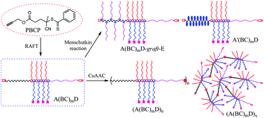 The synthesis and postfunctionalization of A(BC)mD (A = PDMA; B = PEG; C = PCL; D = PNIPAM, PtBA and PMA) comblike block copolymers comprising alkyne and tertiary amino functionalities and alternating PEG and PCL grafts are described. Three-step successive RAFT processes using prop-2-ynyl 4-(benzodithioyl)-4-cyanopentanoate as an original mediator were used to synthesize amphiphilic PDMA(PEG-alt-PCL)mPM (m ≈ 7) heterografted copolymers, in which the PEG and PCL segments were introduced by the alternating copolymerization of styrenic and maleimidic macromonomers. GPC-MALLS and 1H NMR results indicated that the resultant quaterpolymers were of well-controlled molecular weight and relatively low polydispersity (PDI = 1.12–1.25). The combination of end group transformation and the azide–alkyne “click” reaction afforded (A(BC)mD)n (n ≈ 4) comblike-linear multiblock copolymer and (A(BC)mD)x (x ≈ 7) dendritic graft copolymer, and Menschutkin reaction between A(BC)mD copolymer and bromide-functionalized small molecule/macromolecule gave an ion-bearing A′(BC)mD comblike block copolymer and A(BC)mD-graft-E toothbrushlike copolymer, revealing the great potential of postpolymerization modification in novel architecture construction. Preliminary results indicated that the introduction of various functionalities and polymer segments into brushlike copolymers via the quaternization process could affect the chain relaxation and melting behaviors, solubility, and surface wettability of polymer films.