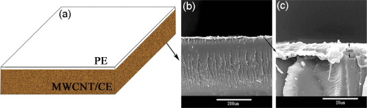 Double-layer materials with one layer being a polyethylene (PE) film and the other layer a multi-wall carbon nanotube (MWCNT)/cyanate ester (CE) resin composite, PE-MWCNT/CE, were prepared. They have high dielectric constant and extremely low dielectric loss. For comparison, MWCNT/CE composites with different contents of MWCNTs were also prepared. Results show that the two kinds of materials have greatly different dielectric properties. With the same content of MWCNTs, the PE-MWCNT/CE material shows a higher dielectric constant and much lower dielectric loss than the MWCNT/CE composite. More specifically, the dielectric constant and loss tangent at 10 Hz of the PE-MWCNT/CE material with 0.5 wt.% MWCNTs are respectively 168 and 0.006, about 1.4 and 2.5 × 10−5 times the values of the corresponding MWCNT/CE composite. The nature behinds these interesting data was detected from the space charge polarization effect and equivalent circuits. The mechanism for the unique dielectric behavior of the PE-MWCNT/CE materials is that the presence of PE film not only reinforces the space charge polarization, but also subdues the leakage current. On the other hand, based on the discussion on the Cole–Cole plots, an effective method is developed to accurately calculate the relaxation time of space charge polarization in electric conductor/polymer materials.