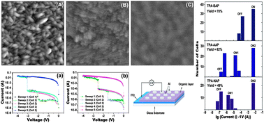 This study reports the syntheses, photophysical and electrochemical properties and memory characteristics of triphenylamine (TPA) donor based molecules with progressively weaker terminal acceptor strength (i.e., nitro, acetyl and bromine). The influence of the terminal electron acceptor strength on the film morphology and the devices storage performances was investigated. Nonvolatile ternary (“0”, “1” and “2” states) memory devices for high-density data storage could be achieved with a simple ITO/D–A molecule/Al sandwich configuration for TPA-NAP and TPA-AAP. It is noteworthy that the memory device based on TPA-AAP exhibited a better reproducibility and stability with lower operation voltages than that based on TPA-NAP, promising low-power consumption data-storage. These obtained results demonstrate that altering the terminal electron accepting strength in D–A molecules can adjust the film morphology and the device performances for the design of future advanced organic electronic devices.